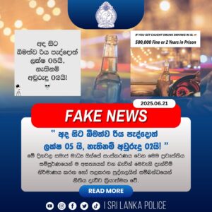 බීමත්ව රිය පදවන අයට ලක්ෂ 5ක් දඩ ගැසීම අසත්ය පුවතක්. පොලීසිය දුන් නිල නිවේදනය