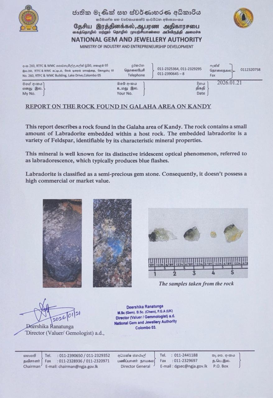 දෙල්තොටවත්ත ප්රදේශයේ නායයෑමකින් මතු වූ “දිදුලන පාෂාණය” පරීක්ෂා කළ මැණික් හා ස්වර්ණාභරණ අධිකාරියේ විශේෂඥ කණ්ඩායම දැන් ඔවුන්ගේ අවසන් වාර්තාව දීලා.